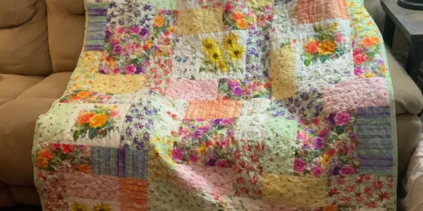 Project Summary: Quilt Type: Patchwork with blocks of varying sizes and a continuous border. Style: Romantic, floral, in pastel shades (pink, yellow, lilac, light green) with touches of vibrant colors. Typical Structure: Combination of patchwork blocks with floral and plain…