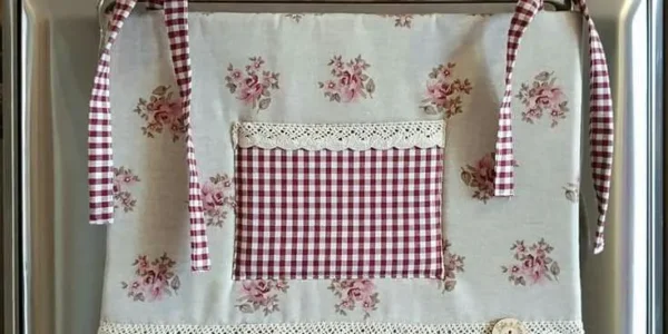 Description: Decorative oven cover with a central checkered pocket, gathered hem with lace, side ties, and rustic-chic finish in a soft floral and red checkered pattern. Project Summary: Type: Oven cover/eyelet (made to hang on the oven door) Style:…