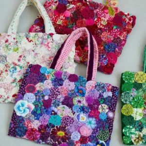 Yo-yo bags are charming handcrafted pieces, made with small circles of fabric gathered and sewn by hand. They are perfect for reusing scraps and creating unique, colorful pieces full of personality — like those in the images, which show vibrant models and also more delicate versions with organized patterns.