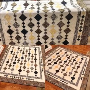 This quilt follows the famous patchwork pattern called Chandelier Quilt. This name means “chandelier” because the design formed by the diamonds resembles the elegant structure of a pendant chandelier. It is a very popular pattern in modern patchwork, as it creates a sophisticated geometric effect using only simple squares.